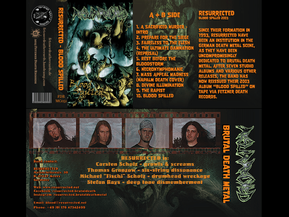 Since their formation in 1993, Resurrected have been an institution in the German death metal scene, as they are uncompromisingly dedicated to producing brutal death metal. After seven studio albums and several other releases, the band has now reissued their 2003 album “Blood Spilled” on vinyl via Schattenpfade and Fetzner Death Records.