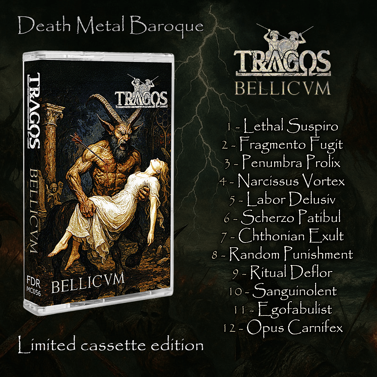 Bio (FR) : Formé à Rouen en 2022, TRAGOS réunit la brutalité du Death Metal old-school avec l'élégance du répertoire classique. Après une démo (Radix Mendosus, 2022) et un EP autoproduit (EP MMXXIV, 2024), le groupe rejoint Fetzner Death Records pour la sortie de son premier album : Bellicum. Entre violence et érudition, TRAGOS explore la tragédie humaine - avec spiritualité, chair et chaos.