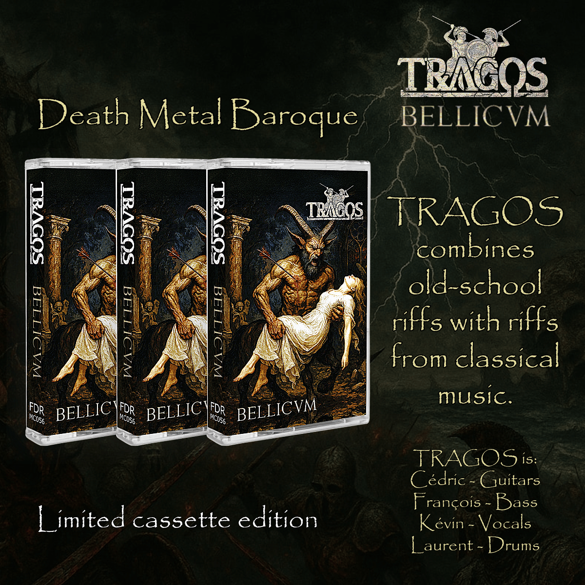 Bio (EN) : Formed in Rouen in 2022, TRAGOS combines the brutality of old-school Death Metal with the elegance of the classical repertoire. After a demo (Radix Mendosus, 2022) and a self-produced EP (EP MMXXIV, 2024), the band signed with Fetzner Death Records for the release of their debut album : Bellicum. Between violence and erudition, TRAGOS explores human tragedy - with spirituality, flesh and chaos.