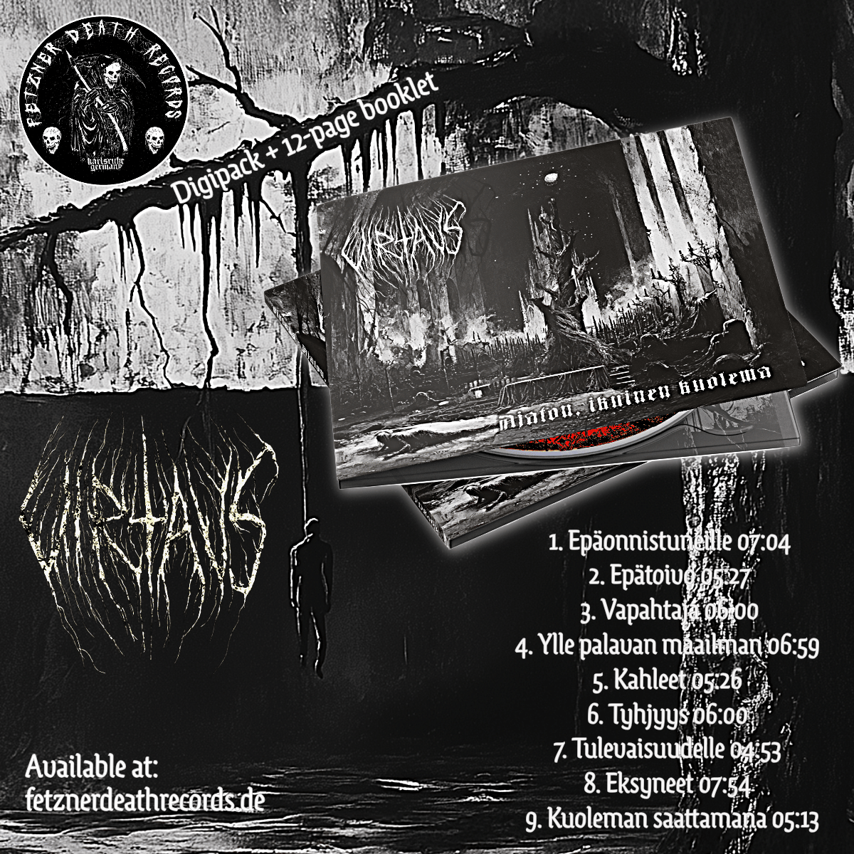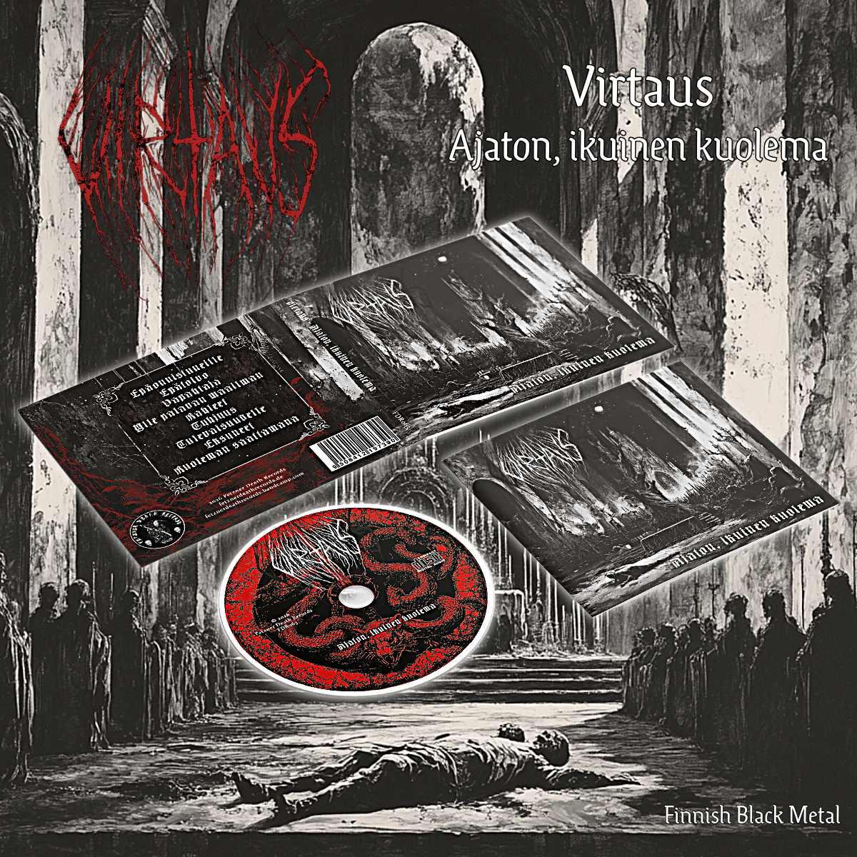 The new album “Ajaton, ikuinen kuolema” from VIRTAUS (The Flow/The Current), is a work of total, uncompromising spiritual nihilism and ritualistic devotion to the abyss. Musically, it is a nuanced evolution of the extreme musical and lyrical art form, seeking to establish a distance to the generic black metal tropes. While the compositions never forget the harsh and brutal origins of the style, VIRTAUS introduces progressive and unconventional aspects, utilizing the destruction of the generic forms to enhance its thematic descent. The music is the relentless current that drags the listener through a world judged and condemned, ultimately delivering them to the transcendent freedom found in its absolute collapse.