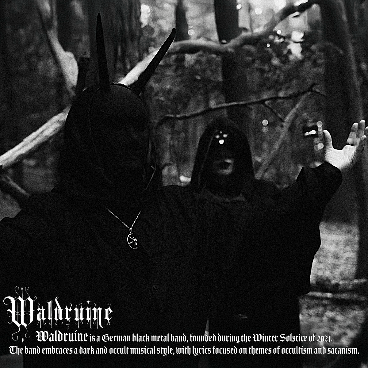 Waldruine is a German black metal band that was formed during the winter solstice of 2021 in Lower Saxony. The band cultivates a dark and occult musical style, with lyrics focusing on themes such as occultism and Satanism.